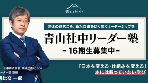 「青山社中リーダー塾」は、激動の時代を切り開き、世界へ通用する能力を身に付けるリーダー養成塾です。塾頭は、青山社中代表の朝比奈一郎が務めます。